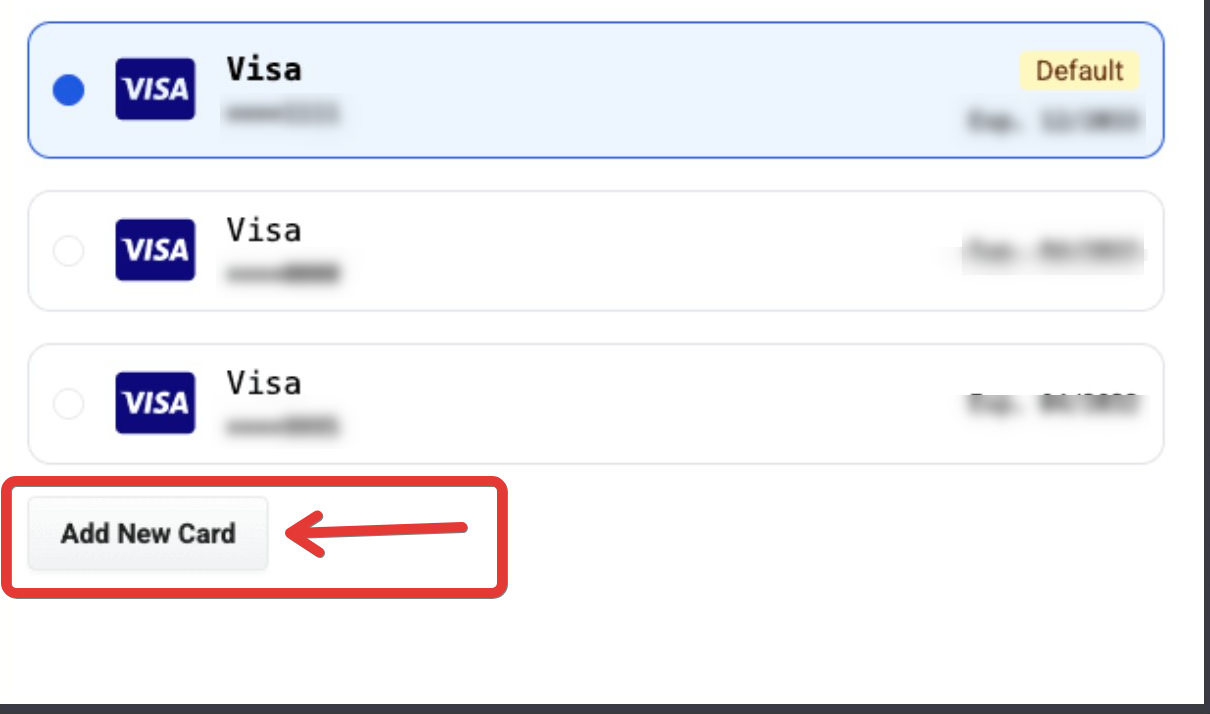 Choose from an existing card on file or, if needed, add a new payment method.